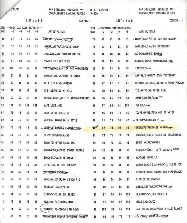 This is the second page of the full rock sales chart for the biggest retail chain in Chicago. Streetwise was #88 that week. Placido Domingo was #74. The Three Tenors were #5.