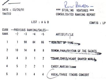 This is the top five on the rock chart in Chicago. The Three Tenors were #5 that week, knocked out of the #1 spot by REM. Virgin Records had me visit record stores in many cities and meet the buyers. This chart is consistent with the charts at retail chains in cities across America.