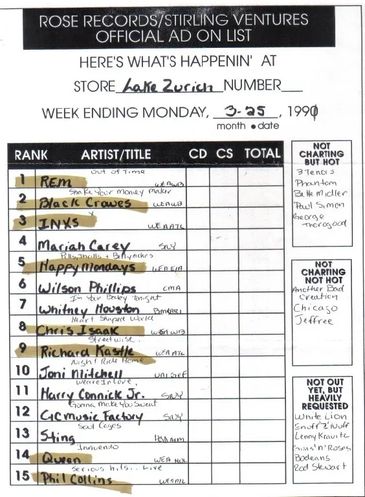 I made the top ten in sales at this individual store in Lake Zurich where I sold more records than Joni Mitchell, Sting and Queen that week.