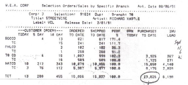 This is the Warner Electra Atlantic national sales report in August 1991. Five months after the release, Streetwise was still selling well. The 10 day sales were 455 with the total WEA purchases to date at 23,825. The President of Virgin Classics and I traveled to the WEA Distribution branch in Philadelphia that week. They showed me my sales on the computer as well as other concert pianists and symphony orchestras with current releases. The other pianists were selling 0 to 3 records every 10 days. The orchestras with new releases were only selling about 5 or 6 records every 10 days.